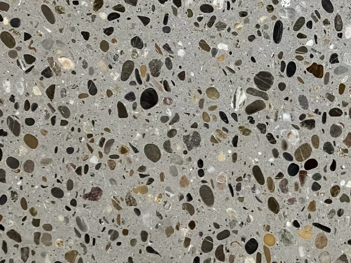 Afwerking: Beton wordt 'gevlinderd' terwijl het nog nat is. betonterrazzo wordt na uitharding volledig vlak geschuurd en gepolijst, waardoor de prachtige interne structuur van de steentjes zichtbaar wordt.