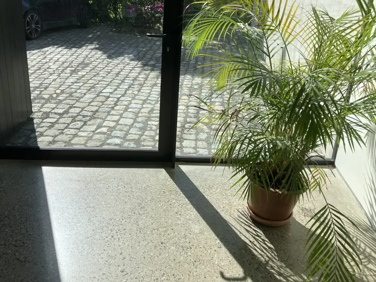 Een betonvloer met terrazzo afwerking combineert natuurlijke granulaatkorrels met een elegante, naadloze afwerking. Het resultaat is een hoogwaardige, unieke vloer.